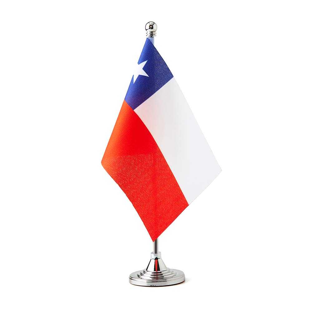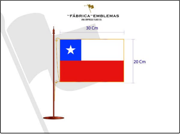 bandera Chilena de 20 x 30 cm estampada full color en raso doble, cordòn de seda lateral y mástl de madera desmontable de 50 cm de alto