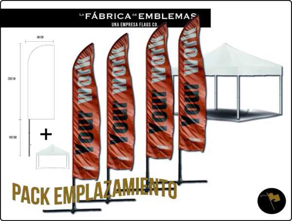 4 Banderas vela completamente personalizadas de 60 x 200 cm, estampadas full color en tela, con mástil desmontable y base en V o X + toldo de 3 x 3 m en lona impermeable con logos y estructura desmontable